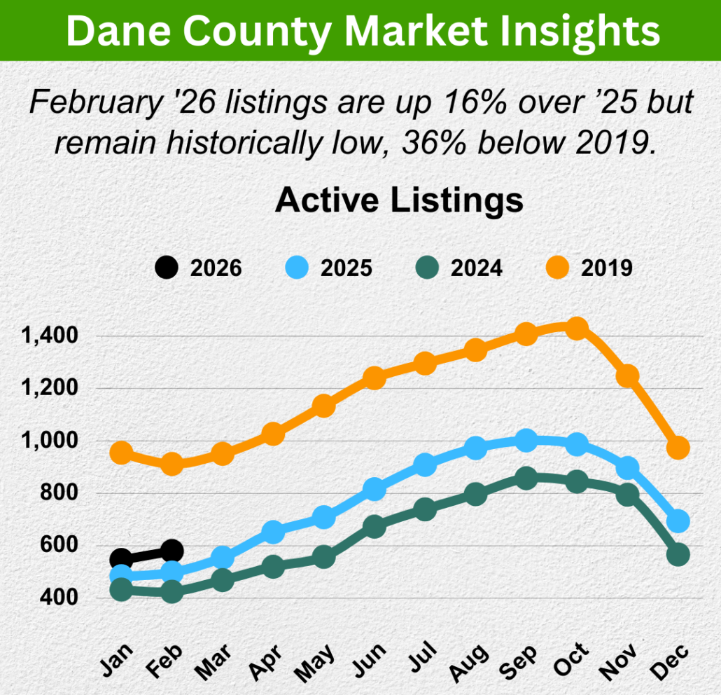 February 2026 active listings are up 16% over February 2025. That’s genuine progress and welcome news for buyers. But zoom out to the 2019 baseline, and we’re still 36% below what a normal Dane County market looked like — roughly 580 active listings today versus nearly 950 in February 2019. We are not in a balanced market. We are in a slowly improving seller’s market.