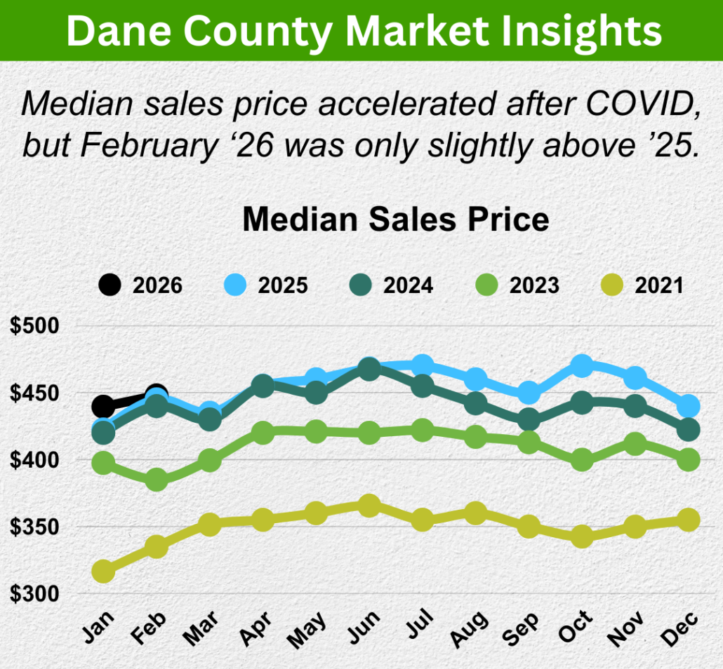 February 2026 median sales prices are tracking slightly above February 2025, continuing a pattern of modest, steady appreciation rather than the sharp annual jumps of 2021–2023. Prices haven’t broken down — and they’re unlikely to — because the two things that cause real price declines (a demand collapse or a supply surge) simply aren’t present in Dane County. UW-Madison, Epic Systems, and the state government aren’t going anywhere, and neither is the demand they generate.